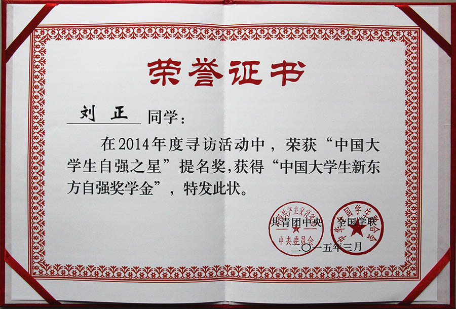 在由团中央、全国学联主办,中国青年报社、中国高校传媒联盟承办,新东方科技教育集团协办的2014年度寻访“中国大学生自强之星”活动评选中,山东政法学院刘正同学荣获“中国大学生自强之星”提名奖,并获得中国大学生新东方自强奖学金。